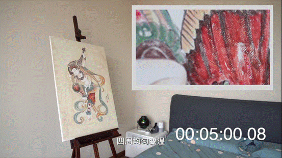 這幅作品是由溫感變色的顏料創(chuàng)作的。開啟海爾舒適風(fēng)Pro空調(diào),當(dāng)溫度達到22℃時,原本無色的壁畫瞬間均勻變色。雷永鋒介紹,如果空調(diào)直吹,壁畫只能局部變色,能讓壁畫均勻顯色是因為空調(diào)的防直吹功能。它也解決了用戶不敢直吹空調(diào)的問題,空調(diào)能精確測算最佳送風(fēng)角度,吹出自然風(fēng)。