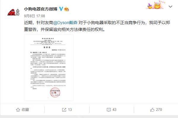 該媒體發布了一則小狗電器官方微博的截屏,顯示小狗電器向戴森發了律師函。該律師函稱,近期,戴森通過第三方平臺全網渠道發布多品牌產品橫向評測視頻內容,針對小狗吸塵器T12做出誤導性評價,對小狗品牌聲譽及產品口碑造成不良影響。不僅如此,該第三方還會有新的類似內容發布,對小狗電器進行持續、不正當的詆毀,行為惡劣。