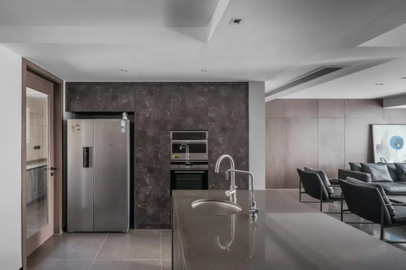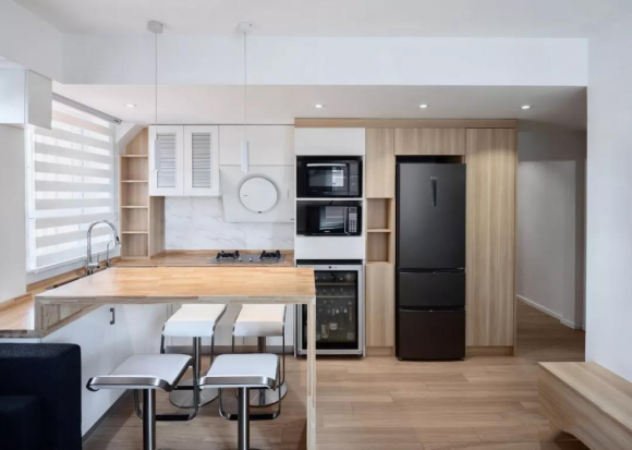 ▼冰箱+櫥柜+各種電器,這種一體化設計簡直太友好,真心建議小戶型這樣裝,太省地兒。開放式餐廚外加一整面墻的定制櫥柜(各種組合家電),整齊且便于打理,最重要的是顏值高、逼格高,家中裝上它就可以混入時尚圈(不過它耗資多一些)。