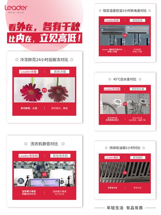 但外觀設計見仁見智,性能才是判斷產品優劣的關鍵。比如Leader空調的HOME一鍵舒適節能,比同類品牌的耗電量節能30%;又如Leader洗衣機,運轉最大噪音不足60分貝,而同類產品卻高達73分貝,種種數字都足以說明其性能優勢。