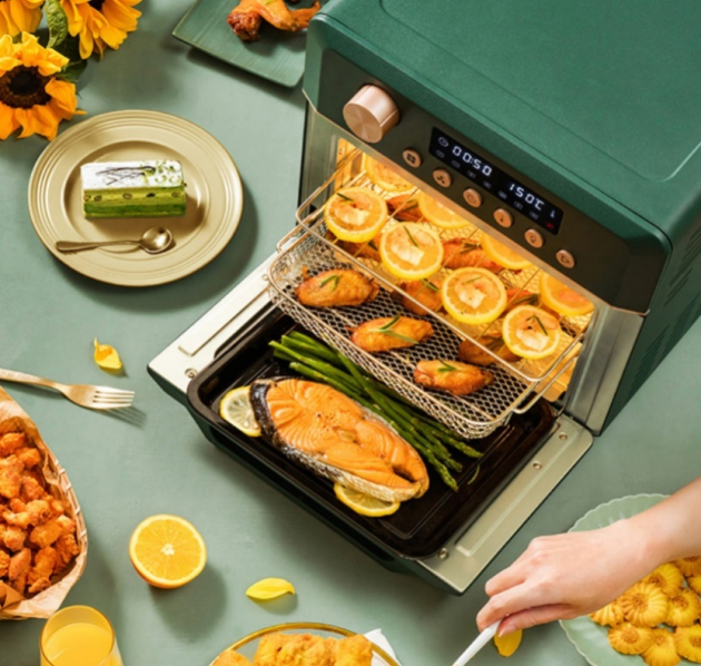 “空氣炸”的工作原理,是通過(guò)風(fēng)扇和發(fā)熱管將加熱的空氣在密閉空間內(nèi)循環(huán),以達(dá)到加熱的作用。同時(shí),靠食物自身的油脂達(dá)到油炸的效果。比起傳統(tǒng)的浸入熱油中油炸,“空氣炸”可減少大量油脂和卡路里,但又能保持酥脆的口感。而相對(duì)于市面上的空氣炸鍋來(lái)說(shuō),空氣炸烤箱的容量會(huì)更大,可炸的食物比空氣炸鍋翻倍,家庭聚餐毫無(wú)壓力;而且炸烤溫度獨(dú)具優(yōu)勢(shì),更加均勻;并且兼具烤箱功能,在烘焙的方面的功力也是不可小覷。空氣炸烤箱可烤,可炸,真可謂斜杠新物種!