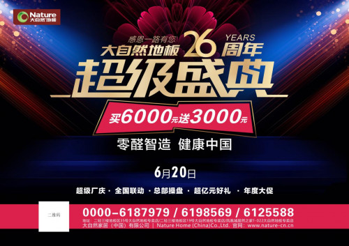 值得一提的是,即日起—6月20日,正值大自然家居26周年慶典,為反饋千萬用戶的支持,大自然地板特發起“零醛智造 健康中國”號召,為消費者送來買6000元送3000元等福利。消費者到大自然地板各大門店選購零醛智造、抗菌地板等系列健康產品,即可享受諸多優惠