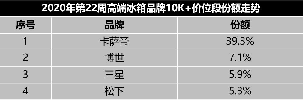 在眾多冰箱品牌中,卡薩帝就是那個(gè)"個(gè)例"。第22周當(dāng)周,卡薩帝冰箱不僅整體份額同比增長(zhǎng)1.6%,在10K+、20K+等不同高端價(jià)位段上,份額也呈增長(zhǎng)之勢(shì)。其中在10K+價(jià)位段,卡薩帝冰箱份額39.3%,同比增長(zhǎng)3.2%;松下為5.3%,同比增長(zhǎng)0.1%;此外,博世為7.1%,三星為5.9%,同比均有所下降。