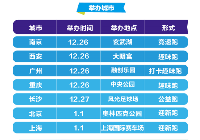 線下跑將覆蓋南京、北京、上海、西安、重慶、廣州、長沙等國內(nèi)七個(gè)一線城市,均在當(dāng)?shù)氐某鞘械貥?biāo)或游玩圣地進(jìn)行舉辦,如南京玄武湖、北京奧林匹克森林公園、西安的大明宮、廣州融創(chuàng)樂園等。