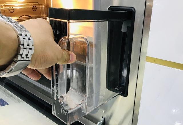 側面是大容量蒸箱水箱,1.5升容量不擔心不夠用。即便是喜歡煲湯的老廣,蒸4-5個小時也不用擔心,操作臺的右上方還有一個添水孔,無需打開艙門即可加水,完全不必擔心蒸汽溫度下降,而影響食材的口感。