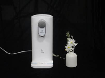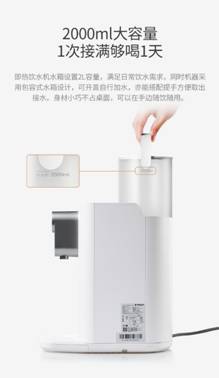 從外觀上來看,這臺機器很小巧精致,顏值在線,它是搭配凈水機使用的臺上式飲吧。里面有一個內置儲水桶,拿下來去接上水,通過機器就可以現場加熱,定量取水。