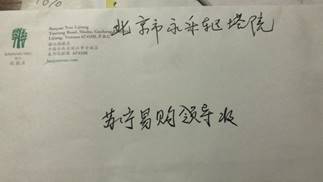 恰好這時,蘇寧物流快遞員趙賢男到樓下準備送快遞,王阿姨叫住他問能不能幫忙把老人背上樓。“這小伙子二話沒說,停好車背起我老伴就送到樓上了,還把我老伴安頓好。我想咱們不能白讓小伙子受累,我要給他感謝費,他說什么也不要,轉身就下樓忙他的工作去了。” 王阿姨說自己真的特別感謝趙賢男,在她和老伴最無助的時候伸出了援手,所以一定要讓蘇寧的領導知道這件事。“本來這封感謝信我是想要郵寄到蘇寧總部的,但是我問了好幾個人他們都不知道蘇寧總部的地址。有人和我說這附近有蘇寧快遞站點,我就一路找過來了。”