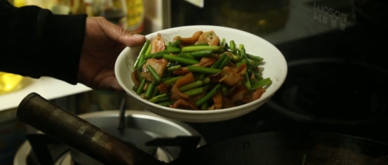 在王女士家,靦腆的丈夫主動擔起了家中“首席掌勺人”的責任,用經年累月的餐食默默表達著對妻子的愛意。一碗牛肚炒蒜苗,大火爆炒,芳香四溢,讓人心生暖意,胃感幸福,是貼心的丈夫為王女士特意備下的。