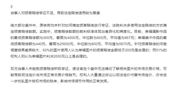 該調研報告顯示,實踐中,損害賠償數額的裁判標準體現出差異化和梯度化。目前,單幅攝影作品的最低損害賠償額為300元,最高為4000元,中位數為800元,平均值為867元;單幅美術作品的最低損害賠償額為440元,最高為25000元,中位數為800元,平均值為5670元。