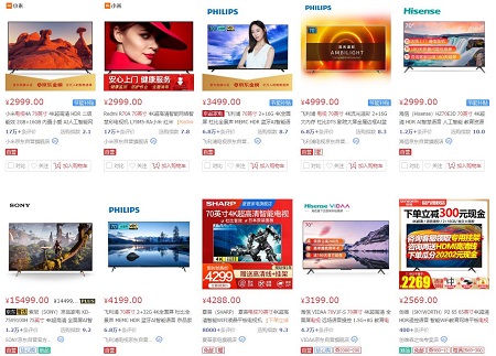 家電消費網登錄京東商城,看到70英寸電視,小米電視4A售價2999元,飛利浦一款同尺寸也只售價4999元,索尼同尺寸一款售價1.5499萬元。(杜佳)