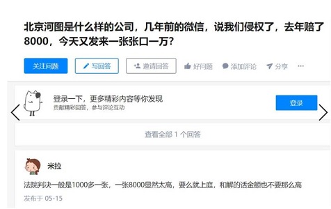 “馮某稱自家圖庫(kù)價(jià)格優(yōu)惠,還攻擊同行的價(jià)格都貴,但索賠時(shí)一張配圖卻索要一萬(wàn)元,也提供不出來(lái)讓其受到多大的經(jīng)濟(jì)損失。2元錢(qián)的成本,卻通過(guò)司法訴訟的方式謀得數(shù)千元的暴利。還占用公用資源。難怪如今北京河圖創(chuàng)意這種索賠方式,在微博、微信、貼吧等社交媒體上非議頗多,被不少人稱遭遇到敲詐式索賠,維權(quán)式勒索,釣魚(yú)式碰瓷。”