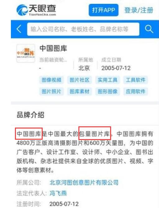 天眼查顯示,在中國(guó)圖庫(kù)公司的介紹中,就稱其是中國(guó)最大的包量圖片庫(kù),歸屬北京河圖創(chuàng)意圖片有限公司。法人代表是馮飛燕。