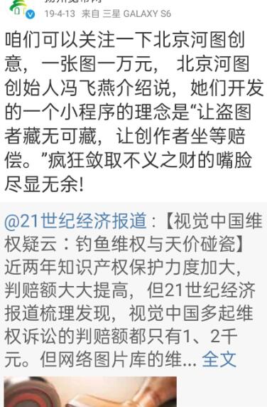 河圖公司馮飛燕:一圖2元 網(wǎng)友:索賠一萬(wàn) 支持國(guó)家版權(quán)局整治惡意索賠