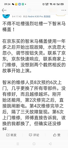 “智米電暖氣智能版是在淘寶智米旗艦店買的。中間有各種小毛病,例如加熱異響,觸控屏幕開關(guān)失靈,無法連接wifi等,都忍了。終于在去年底砰的一聲,家里斷電了。維修還讓我自己付費去寄送。”“智米取暖器突然壞了,就只能用兩年嗎?”“智米智能馬桶蓋又壞了,已經(jīng)是第四個了。平均兩個月壞掉一個的速度,真實讓人崩潰!這是淘寶上買過最失望的產(chǎn)品,沒有之一。”“智米加濕器壞了。買過智米風扇599和智米加濕器799。典型的高價低配,價格虛高,再也不買智米的東西了。”