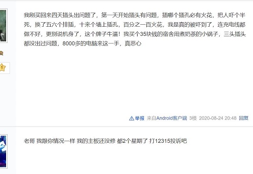 “我剛買回來四天,電腦插頭出現問題了,插哪個插孔必有火花,把人嚇個半死。連充電線都做不好,更別說機身了。我花35塊錢的買個煮奶茶鍋子,三頭插頭都沒出現問題,機械師電腦8000多元,太惡心了。”