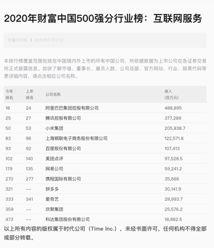 2020年《財富》中國500強發布,小米位列互聯網服務公司前三強