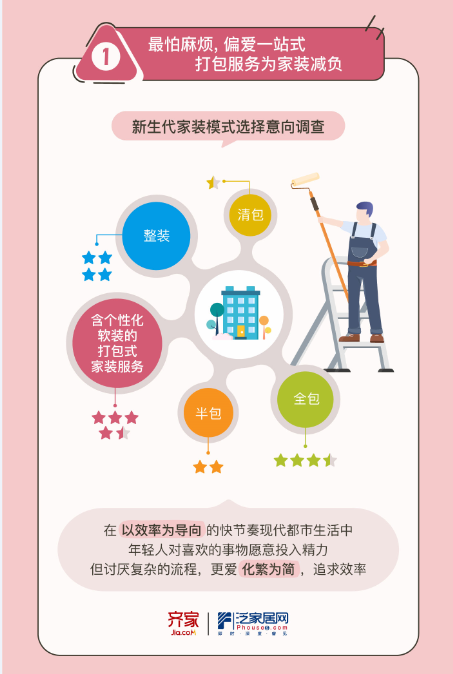 與此同時(shí),添加個(gè)性化軟裝的一站式家裝服務(wù)受到了年輕人的最高好評,疫情推動(dòng)了家裝行業(yè)數(shù)字化的發(fā)展,使一站式、線上線下一體化的家裝服務(wù)更為普及,這恰好滿足了新生代消費(fèi)者對化繁為簡、效率的追求,該類服務(wù)或?qū)⒊蔀槲磥砑已b領(lǐng)域的主流服務(wù)方式。