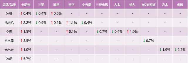 中怡康6月30日發(fā)布的第26周監(jiān)測數(shù)據(jù)顯示,在冰箱市場,卡薩帝、博世份額同比提升,三星下滑;洗衣機(jī)市場,卡薩帝、松下份額同比提升,小天鵝、三星下滑;空調(diào)市場,卡薩帝、松下、格力份額同比提升,三菱電機(jī)、大金均有所下滑;熱水器市場,卡薩帝份額同比提升,AO史密斯下滑;廚電燃?xì)庠钍袌觯ㄋ_帝份額同比提升,方太、老板下滑;冰吧市場,卡薩帝份額同比提升。