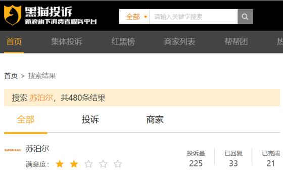 目前在黑貓投訴平臺上,蘇泊爾的投訴量共225條,已處理完成21條,已回復33條,滿意度只有兩顆星。