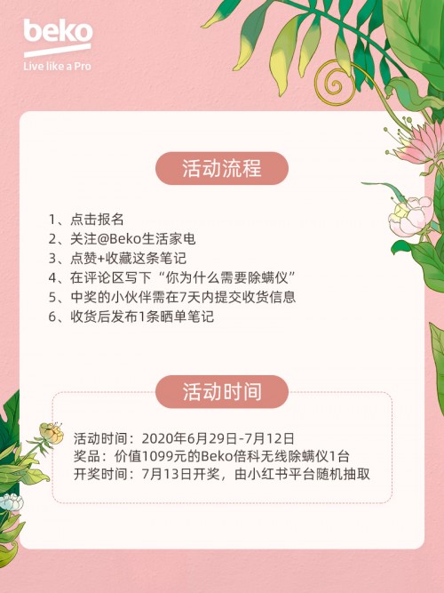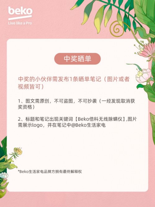 我們的官方小紅薯“Beko生活家電”也在進行抽獎活動哦,毛曉彤、姜妍同款除螨儀送你!