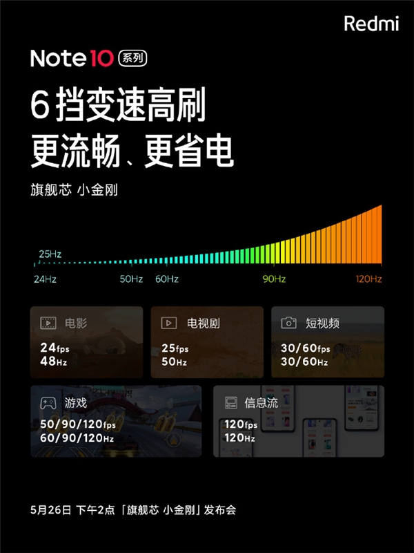 今天,紅米又公布了更多產(chǎn)品細節(jié)。此次Note10系列將搭載120HZ高刷、240Hz高觸控、6 擋變速的LCD屏幕。其中,6檔變速高刷功能覆蓋區(qū)間從24-120FPS,可在看劇或刷短視頻時調(diào)節(jié)為24-60FPS,既能逐幀對應(yīng),又能避免高功耗;而在玩游戲和瀏覽信息流等需要高幀率的場景下,智能調(diào)節(jié)為50-120FPS,使畫面更加細膩流暢。可以說,Note10的變速高刷屏幕能根據(jù)不同顯示內(nèi)容智能調(diào)節(jié)幀率,流暢和續(xù)航兩不誤。