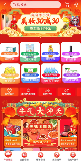 登錄蘇寧易購APP,進入“年貨大集”,原產地直采的土特產果蔬、鹵味、酒水、休食、潮流智能家電3C和日常防護用品等產品,非常豐富。