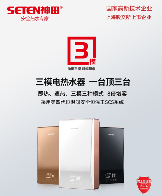 當(dāng)同行都在思考如何開發(fā)更低成本的單模速熱、雙模速熱的時(shí)候,神田開發(fā)三模電熱水器,用即熱、速熱、三模三種加熱模式,充分足滿足消費(fèi)者的沐浴需求。水量更大是消費(fèi)者的基本需求,所以神田放棄當(dāng)時(shí)同行都在大量使用的16L容量設(shè)計(jì),新產(chǎn)品都是 20L以上大容量設(shè)計(jì),如今大容量速熱式電熱水器成為了行業(yè)的主流。