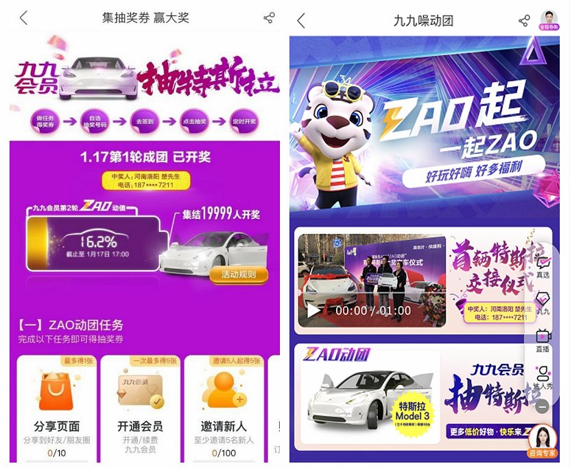此外,快樂達人秀決賽、ZAO動團特等獎特斯拉等ZAO活動也持續高能,特別是ZAO動團-九九會員抽特斯拉 Model 3使用權的活動,早在1月19日就有幸運用戶楚先生獲得使用特斯拉大獎并開心領走,讓朋友圈好友羨慕不已。話說,只要升級成九九會員就能集抽獎券抽豪車,“真快樂”為消費者快樂購物也是真拼真ZAO了。