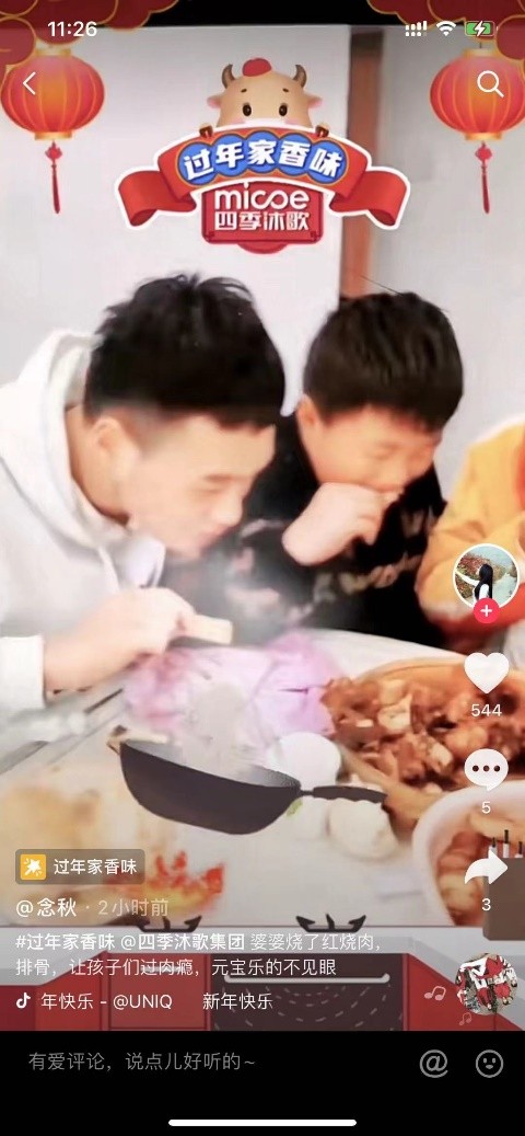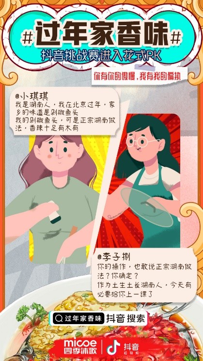 而今年,為了響應新冠疫情防控政策,過年期間的聚會頻次和聚餐人數都減少了,還有很多在外打工的“游子”,迎合“就地過年”的倡議,選擇在異鄉過年。這樣看來,過年最重要的“吃”這件事,就變得沒有往年那么熱鬧了。但四季沐歌聯合抖音共同舉辦的“過年家香味”美食挑戰賽活動,卻將數以萬計的人們齊聚云端,為自己的家鄉菜打“call”!這場匯聚大量“國民美食”的賽事,展示了網友們各種做美食的歡快場景,解決了大家不能聚會暢吃的遺憾,讓這個牛年春節變得更有年味了。