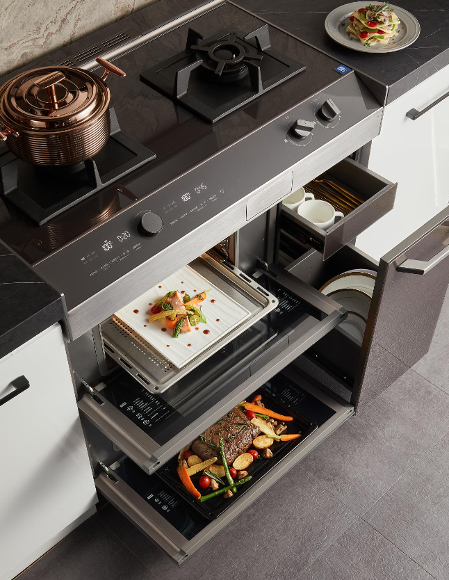 轉眼間,Master Kitchen M7烹飪立方四大模塊全局聯動,正為國慶假期打造一頓完美的團聚大餐:來自純凈海域的貽貝,開貝的瞬間飄散出海水的芬芳;130°C高溫蒸汽下,細潤蒸汽瞬間包裹龍蝦,緊鎖原鮮口感與營養;而意式風情燴牛排在5.0kw烈焰的征服下,香氣升騰;一旁,秋季鮮蔬也滋滋下鍋,時令風味伴著食材的精妙演變彌散開來。此刻你只需輕拉下方的碗碟收納拉籃,便可把誘人的美食裝載在碗碟中。