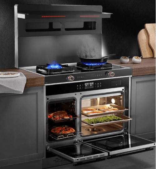 在如今廚房空間壓縮、廚房烹飪體驗感不佳等時代背景下,多功能、省空間的蒸烤款集成灶產品受到更多現代家庭的青睞。這款上派F1-ZK左右蒸烤集成灶,不僅將煙機、燃氣灶、蒸箱、烤箱四重廚電集于一身,還將下方蒸烤箱設計成左右蒸烤款,真正意義上實現了蒸烤同步,美味加速的高效烹飪。
