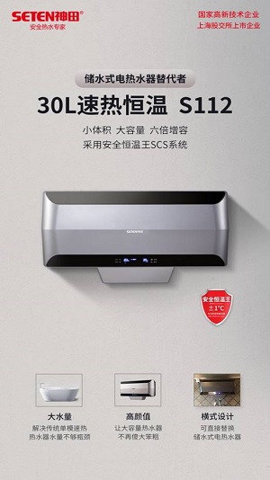 2020年,神田推出30L大容量速熱式電熱水器S112,同等條件下熱水輸出量更大,在夏天的時候使用,加熱幾分鐘,可以一直洗下去,帶給消費者絕佳的沐浴體驗。如果消費者掌握使用技巧,夏天幾乎可以實現即開即熱的功能。在冬天的時候,也可以為沐浴者提供長時間的熱水供應,解決了16L小容量單模速熱產品熱水量不夠的問題。