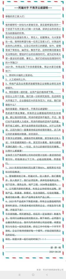 諶厚榕在內(nèi)部信中分析了2021年的市場(chǎng)情況,總結(jié)出原材料大幅的上漲波動(dòng)、人工成本的上升、傳統(tǒng)產(chǎn)品及業(yè)務(wù)需求放緩導(dǎo)致企業(yè)銷售業(yè)績(jī)無(wú)法持續(xù)提升、出貨產(chǎn)品價(jià)格持續(xù)下降等觀點(diǎn)。