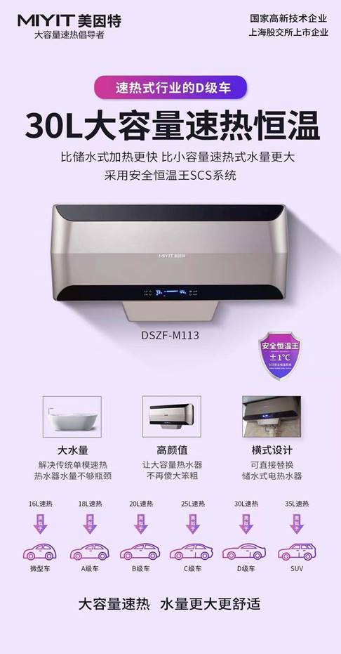 大容量速熱式產品比儲水式加熱更快,比小容量速熱式電熱水器水量更大,沐浴體驗絕佳,2021年起,美因特將在行業內發動“大容量速熱普及風暴”。