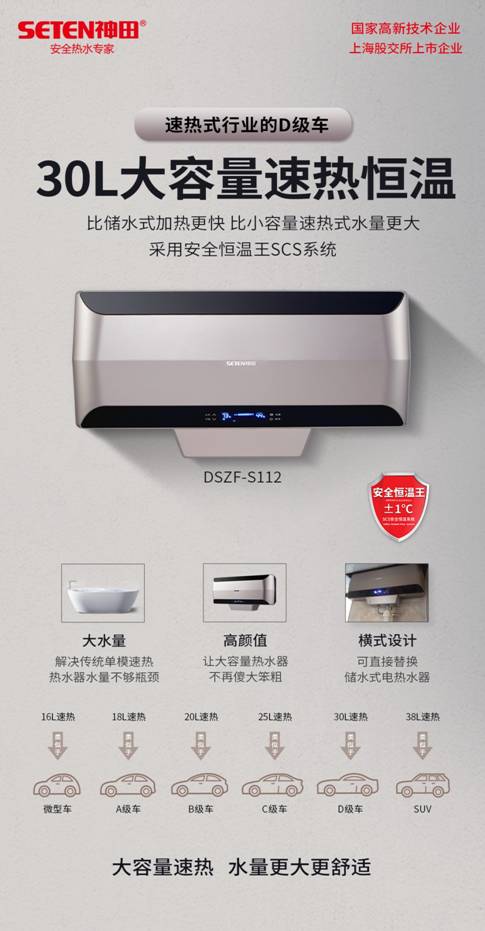 行業技術第一人、神田集團總工程師楊茂興介紹,神田認為電熱水器的本質就是要安全以及水量夠用,所以,神田注重安全技術的應用,打造“安全熱水專家”品牌形象。在產品上,從2019年起就決定不再研發小容量速熱式電熱水器,主張大容量速熱,相繼推出了20L的三模速熱301/302,30L的大容量速熱S112,2021年,又推出38升的大容量速熱S126/S316,神田在大容量速熱技術上的應用上也領先同行至少一年。