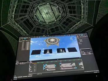 有別于傳統的光影秀節目,《大先生》在結合原有禮堂空間結構的基礎上,利用投影覆蓋穹頂,將其與舞臺的紗幕相結合,將光影范圍擴展到最大,使觀眾的沉浸感更強。項目團隊為了最大限度確保現場效果,于現場搭建6組投影點位,并從視覺呈現方案入手,在大禮堂針對穹頂和舞臺進行多次的勘測、計算,并使用專業軟件進行反復預演,穹頂顯示面積達490平米,也是國內高校穹頂應用首次呈現;同時,搭配80平米舞臺紗幕顯示,最終在活動現場給觀眾帶來一場震撼人心的視覺盛宴。