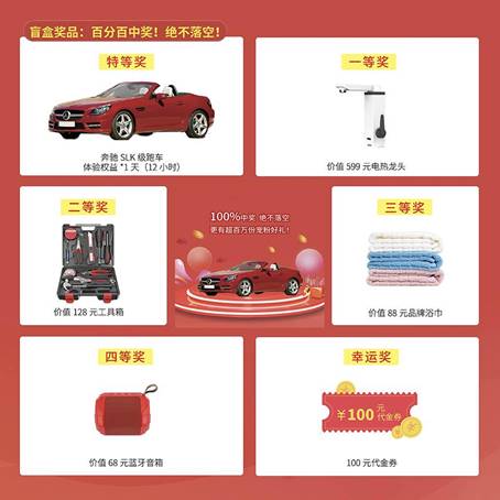 除了豪華跑車體驗(yàn),盲盒獎(jiǎng)品還包括電熱龍頭、工具箱、浴巾、藍(lán)牙音箱、代金券等。