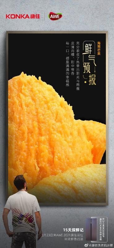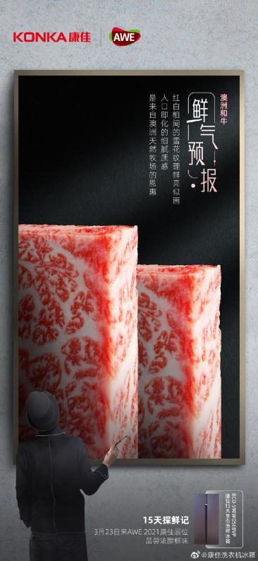 而近日,康佳利用網友們提及的特色食材,正式發布了一組“鮮氣預報”的海報,有極品新鮮和牛,新鮮的熱帶水果,海報上的食材紋理特寫令人垂涎欲滴,還有天氣預報式的語氣播報食材的新鮮程度,十分令人上頭,感覺鮮氣已經從屏幕里蔓延出來了!單看這組海報的精彩程度,相信 AWE 2021康佳展位,少不了精彩!