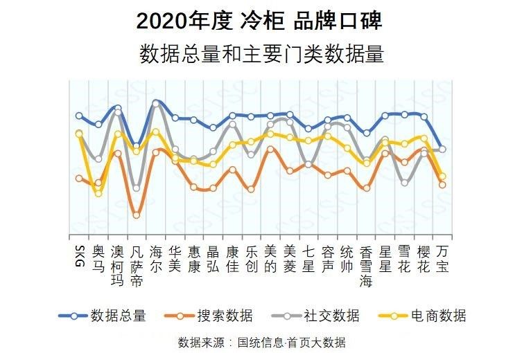 報(bào)告共涉及20個(gè)冷柜品牌(SKG、奧馬、澳柯瑪、凡薩帝、海爾、華美、惠康、晶弘、康佳、樂(lè)創(chuàng)、美的、美菱、七星、容聲、統(tǒng)帥、香雪海、星星、雪花、櫻花、萬(wàn)寶)16,544萬(wàn)條數(shù)據(jù),搜索、社交、電商三個(gè)主要數(shù)據(jù)門類比例為1 :0.937 :0.733。