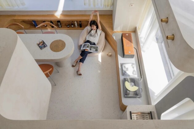 被隔出的二層空間有開放式臥室、衛生間,還有一張書桌兼化妝臺,滿足了剛剛踏入職場的女孩的需求。二層臥床的下方是沙發區,兩側與頂部都有遮蔽,非常有安全感。坐在這兒的時候,冰冰感覺就像在船艙里。現在,這個40㎡的小房子已經成了冰冰的小天地,她在這里接待了很多朋友,當然,父母是她最重要、最歡迎的客人。
