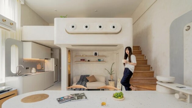 冰冰對當代藝術非常感興趣,希望自己的家能夠自然地流露出藝術氣息。如果擺放裝置藝術品,會讓這個空間顯得更加擁擠。于是,設計師選擇在硬裝中“做雕塑”。曲線、轉角、圓筒、錐體……墻體、隔板和臺面上出現各種幾何造型,就像一件件雕塑作品。設計師用石膏塑形,外部再涂上和墻面一樣的手刷漆,讓這些雕塑體塊完全融于整個空間里。