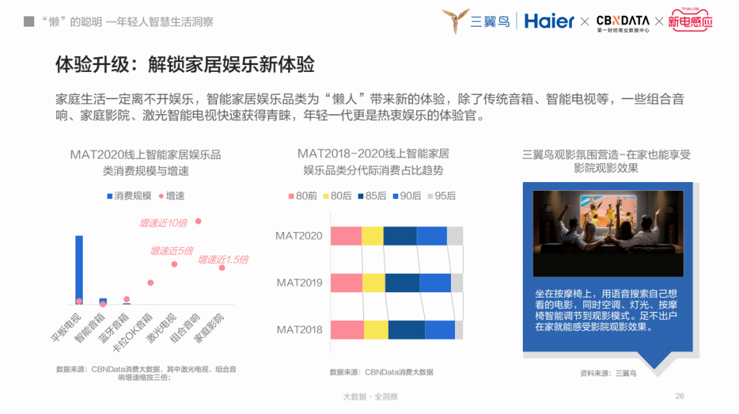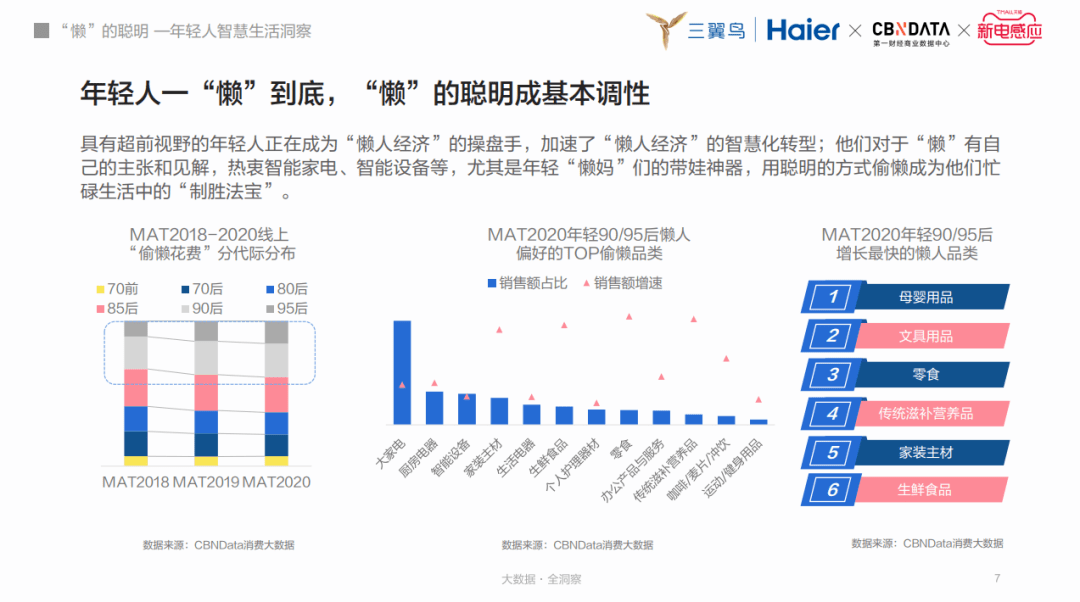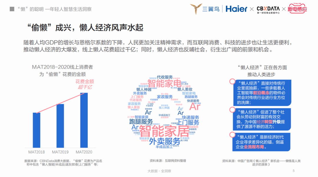 1月19日, 第一財(cái)經(jīng)商業(yè)數(shù)據(jù)中心聯(lián)合海爾三翼鳥與天貓新電感應(yīng)發(fā)布《“懶”的聰明——年輕人智慧生活洞察報(bào)告》(以下簡稱CBNData《報(bào)告》,點(diǎn)擊閱讀原文查看完整報(bào)告),基于CBNData消費(fèi)大數(shù)據(jù),分析“懶人消費(fèi)”背后的消費(fèi)觀念升級(jí),并從娛、住、衣、食四個(gè)方面解碼新一代消費(fèi)者的“懶”系主張,通過“懶人經(jīng)濟(jì)”的內(nèi)在邏輯全面解讀智慧生活。