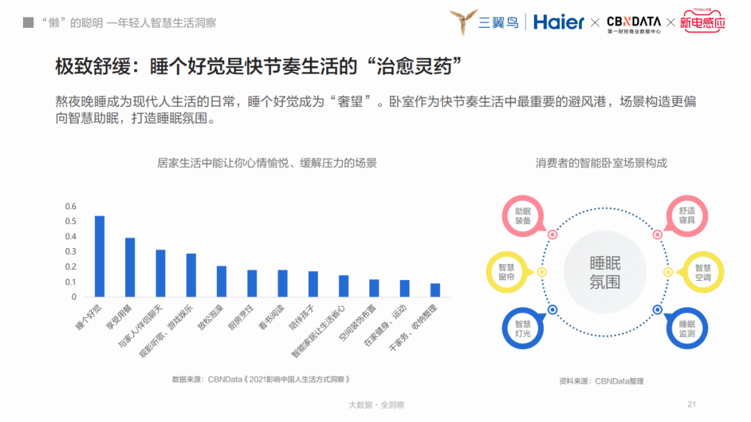 雖說許多年輕人將“睡覺”視為一大愛好,數(shù)據(jù)也顯示“睡個(gè)好覺”是最能讓自己心情愉悅、緩解壓力的居家場景,但在快節(jié)奏的生活中,他們卻常常熬夜晚睡,甚至失眠到天亮。舒適寢具、助眠裝備、睡眠監(jiān)測(cè)、智慧窗簾等,逐漸成為智能臥室的標(biāo)配。