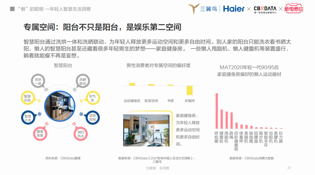 而陽臺(tái),除了洗衣、晾衣、種綠植,更成為 多功能的娛樂第二空間,承載起年輕人運(yùn)動(dòng)健身、寵物喂養(yǎng)、衣物洗烘、收納等功能。CBNData《報(bào)告》發(fā)現(xiàn),2020年線上懶人運(yùn)動(dòng)健身產(chǎn)品的消費(fèi)人數(shù)是2018年的1.8倍,其中90、95后占比超四成,呼啦圈、健腹輪、甩脂機(jī)是他們偏愛的居家運(yùn)動(dòng)器材。