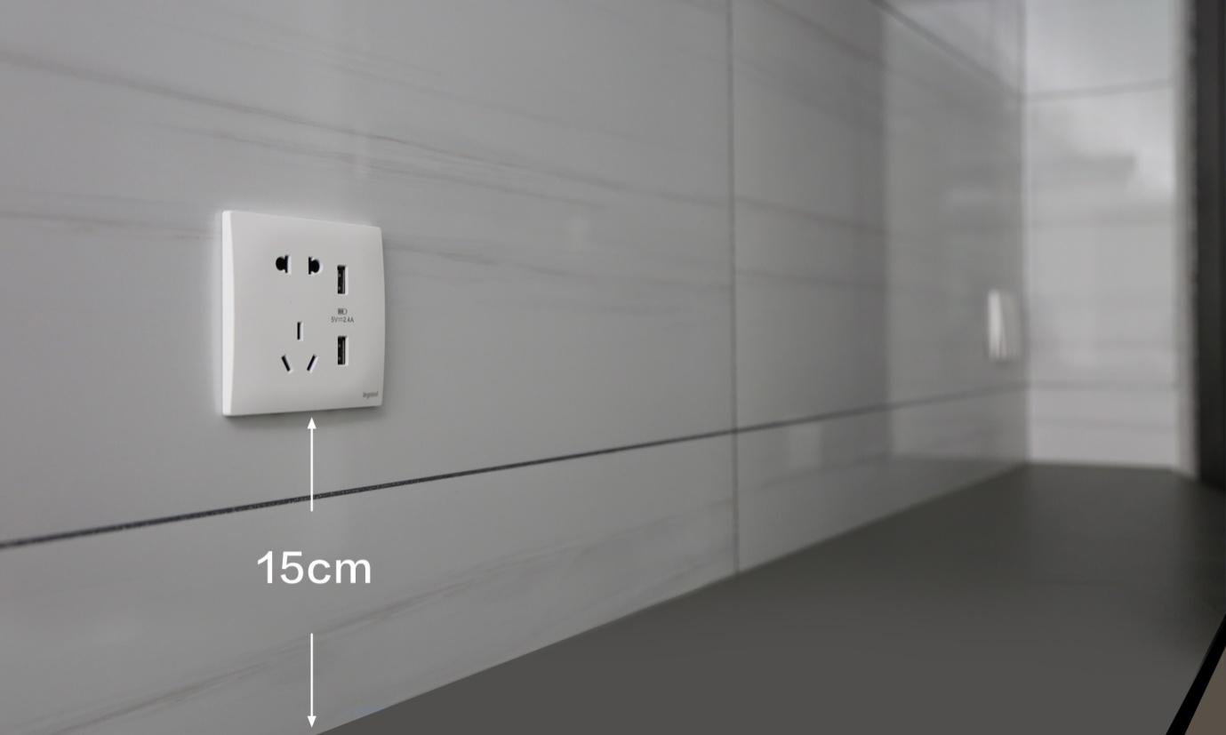 吧臺柜設置并排開關和插座,位置在臺面上方20cm處。