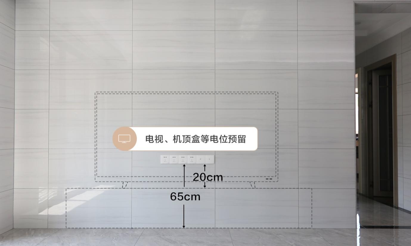電視墻建議預先想好需要購買的電視柜高度,在電視柜上方設置插座,電視可以將插座以及相應的線纜遮擋,更加美觀。