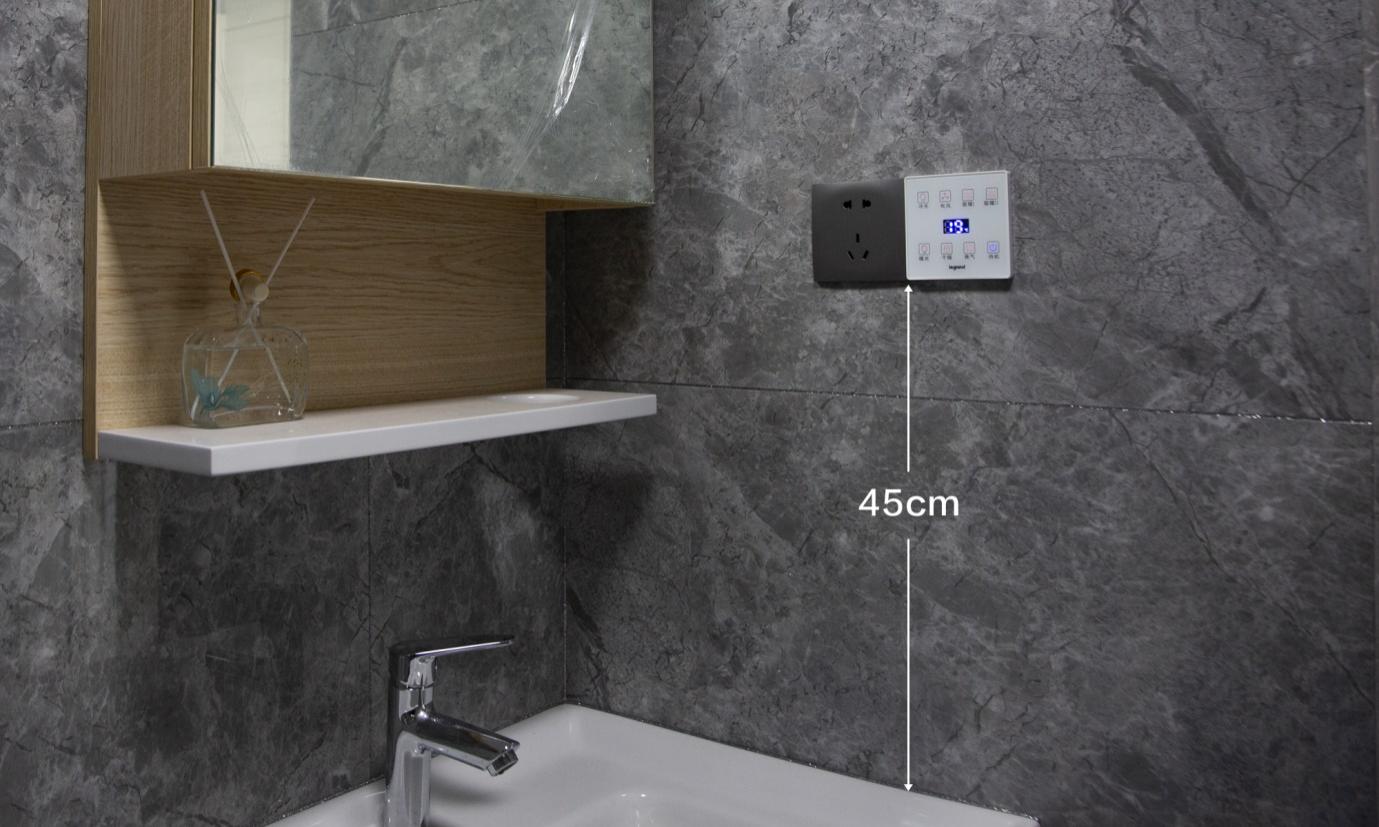 洗手盆上方45cm處設置五孔插座、多功能浴霸開關。