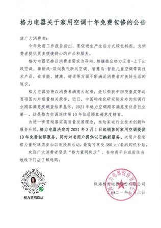 轟動業界的還有后來的家用空調“十年免費包修”政策。今年3月,格力發布公告,正式宣布對2021年3月1日起購買的格力家用空調實行“十年包修”服務,再次將售后服務保障提升到新層次。值得玩味的是,截至目前,行業內仍無同行跟進。