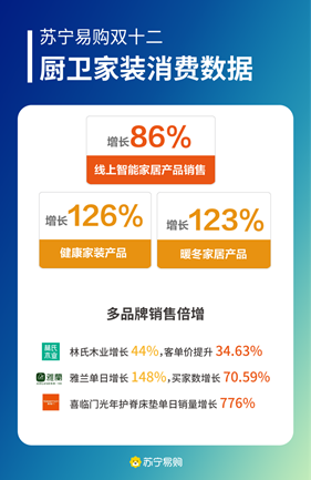雙十二期間,頭部家裝品牌和產(chǎn)品在蘇寧易購也迎來高增長。數(shù)據(jù)顯示,林氏木業(yè)雙十二銷量同比增長44%,客單價同比提升34.63%;雅蘭12.12單日爆發(fā)增長148%,買家數(shù)增長70.59%;喜臨門光年護脊床墊雙十二當天銷量增長776%,帶動品牌銷售增長10%;雷士雙十二銷量增長超60%。