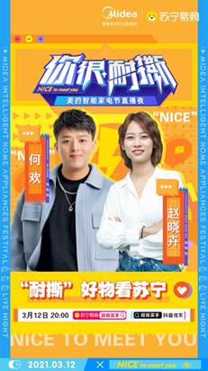 此外,直播帶貨、社交營銷等越來越成為消費者喜聞樂買的渠道,蘇寧家電將攜手總裁天團、各路明星網紅開啟315家電直播盛典。除3月5日宋祖兒等明星直播外,3月12日蘇寧家電將聯合美的打造主題為“你很耐撕”的反帶貨吐槽直播夜,邀請到號稱“車間一枝花”的騰訊綜藝《脫口秀大會》嘉賓趙曉卉和大碗娛樂簽約藝人 何歡,通過隊伍PK的形式講述家電使用槽點、選購指南等,推出家電一站購福利。后續還有哪些神秘嘉賓,值得期待。